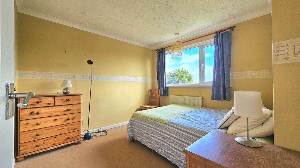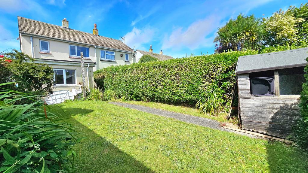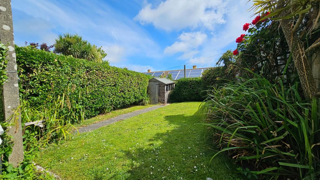 Outside, the property boasts a lawned front garden with a pathway to the entrance and a rear garden with mature planting and a timber shed, perfect for enjoying the Cornish sunshine.