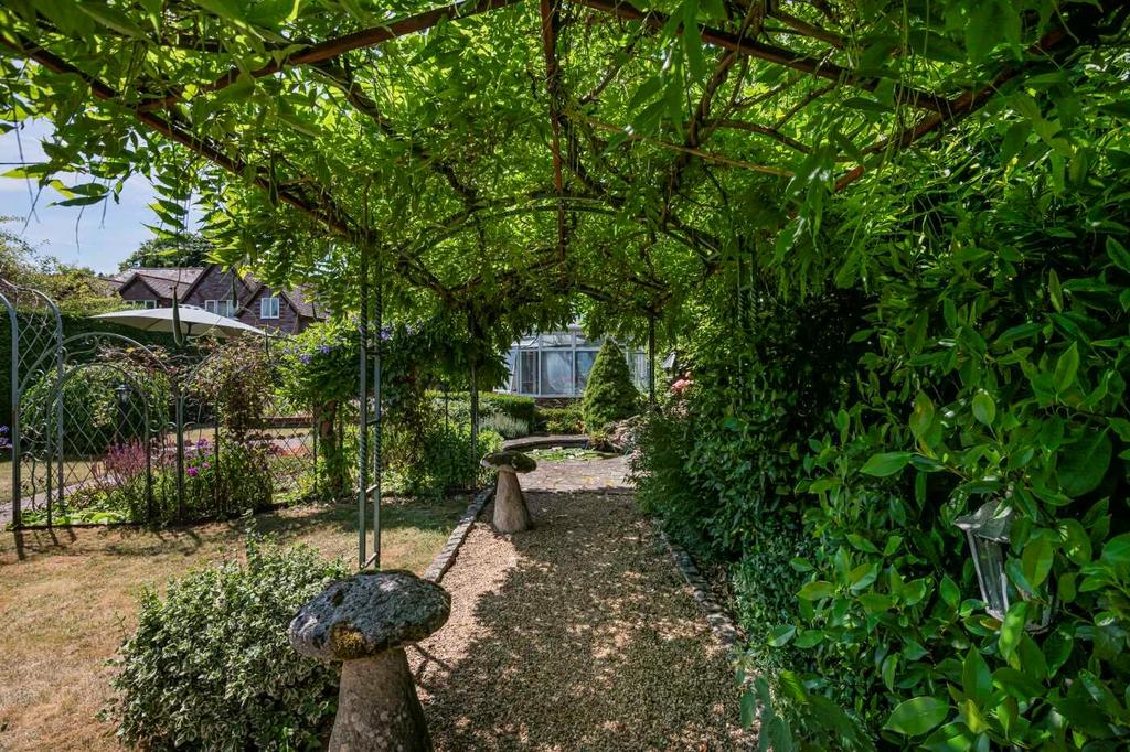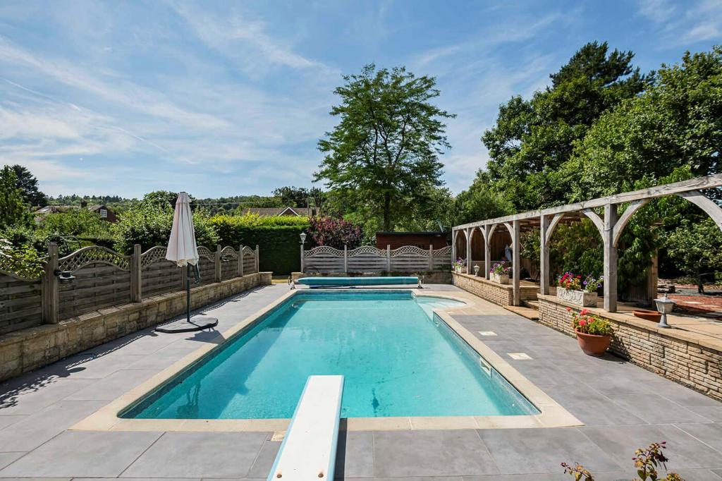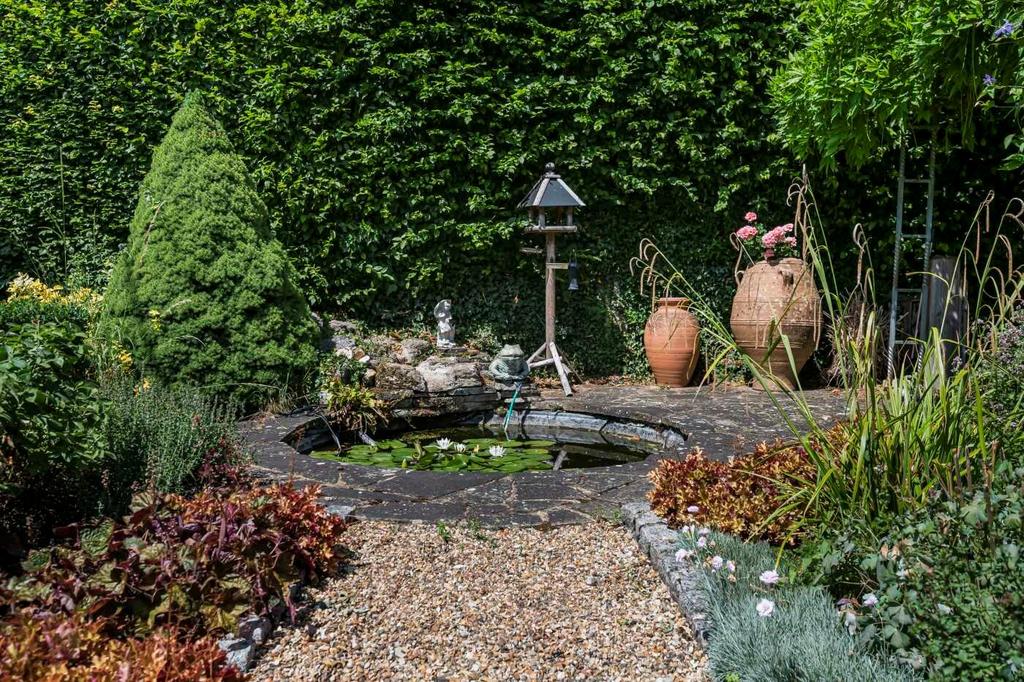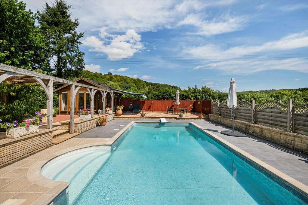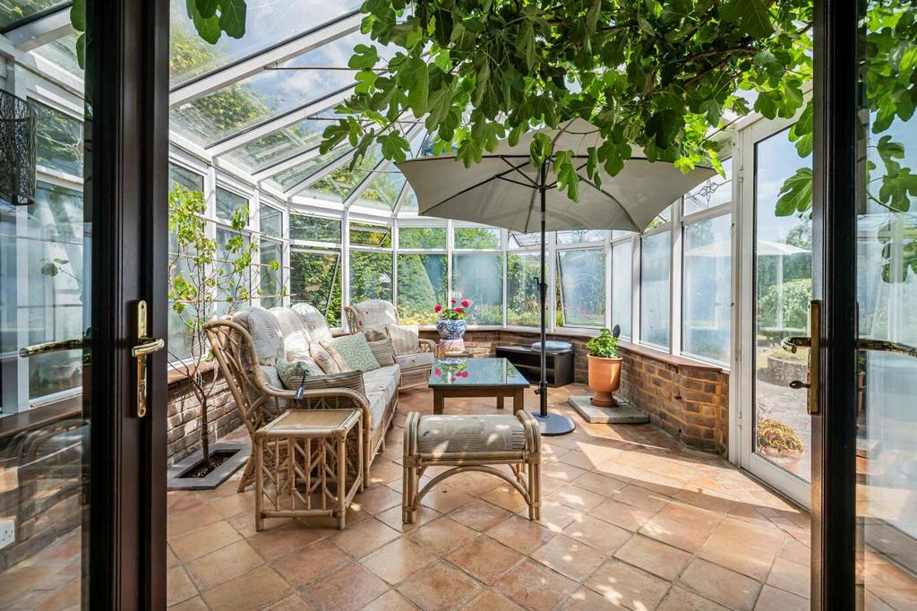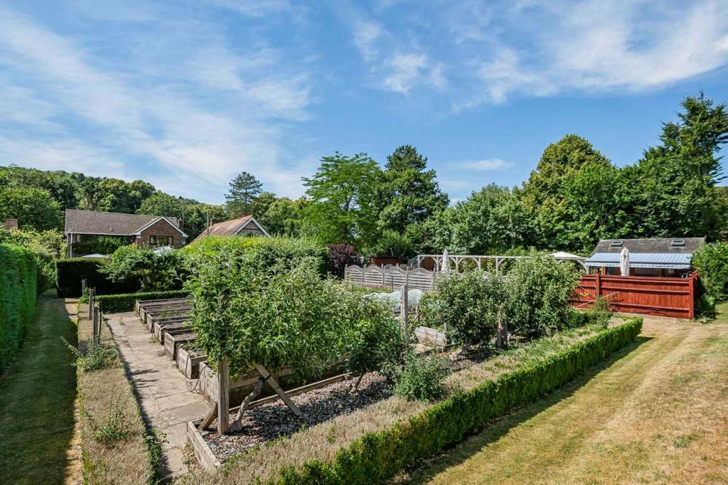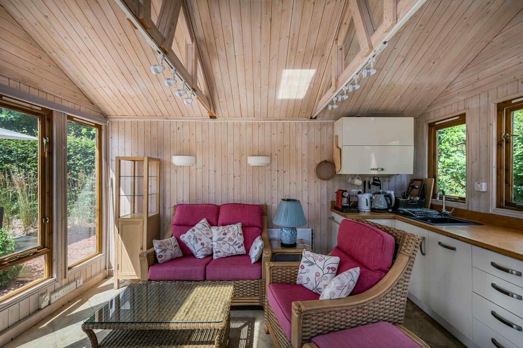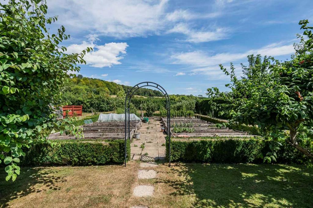The rear garden is a key feature, arranged over a series of brick terraces with raised flower beds and an ornamental pond. Planting includes wisteria, clematis, a weeping mulberry, quince tree, and bay bush. Beyond this, a productive kitchen garden offers 12 raised beds for vegetables and herbs. The adjoining swimming pool area is well designed, with terracing and walling. A raised terrace in front of the Garden House/Pavilion includes a fitted kitchenette with tiled flooring, internet access, and a two-ring induction hob.
