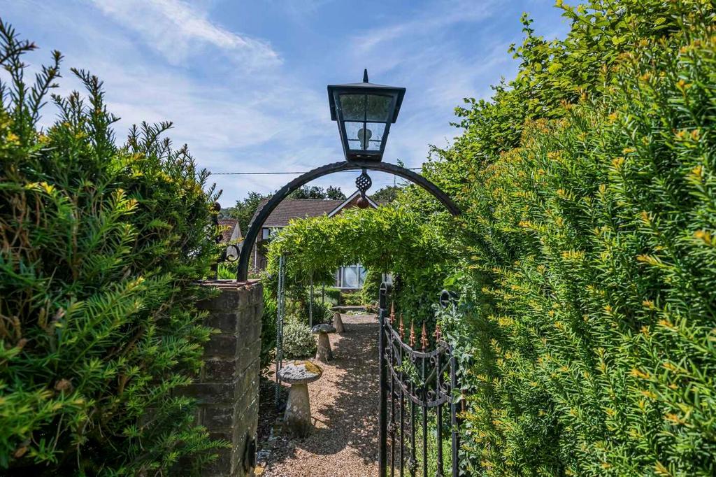 The property is approached via a gravel driveway, providing ample parking and access to a detached double garage. Mature hedging on either side offers a good degree of privacy from neighbouring properties.