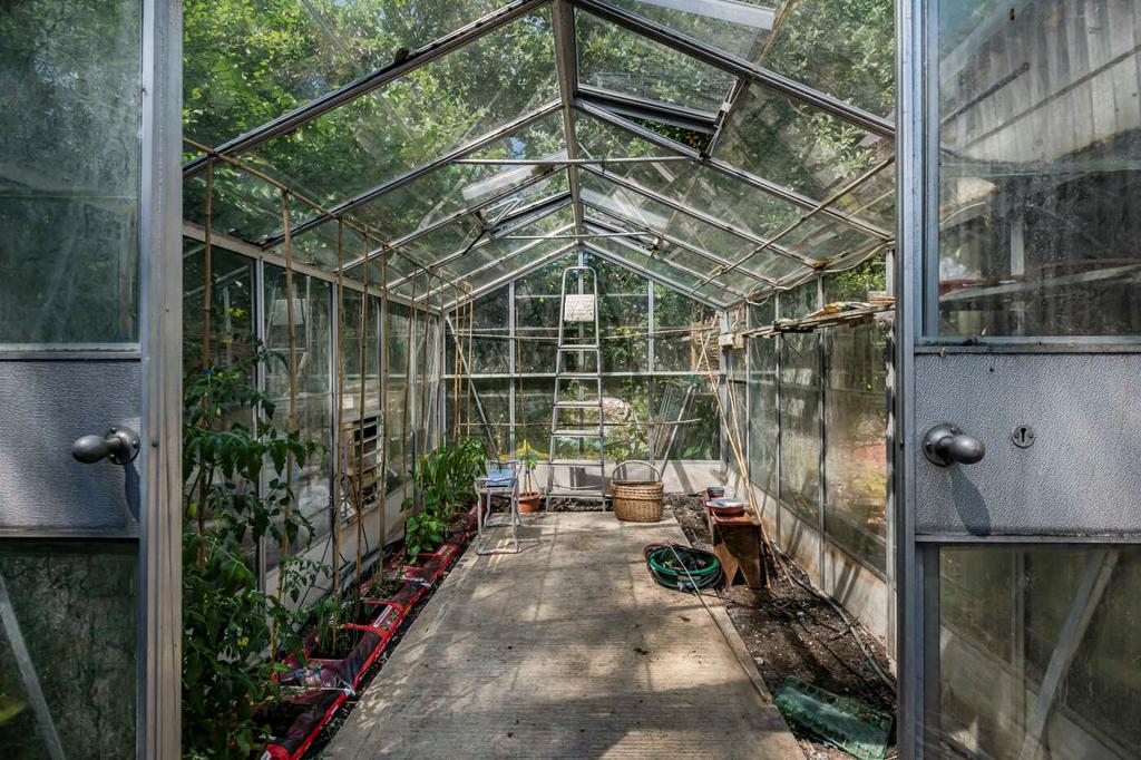 Additional features include a garden shed housing the swimming pool equipment, an air source heat pump for pool heating, a greenhouse, and a garden irrigation system.