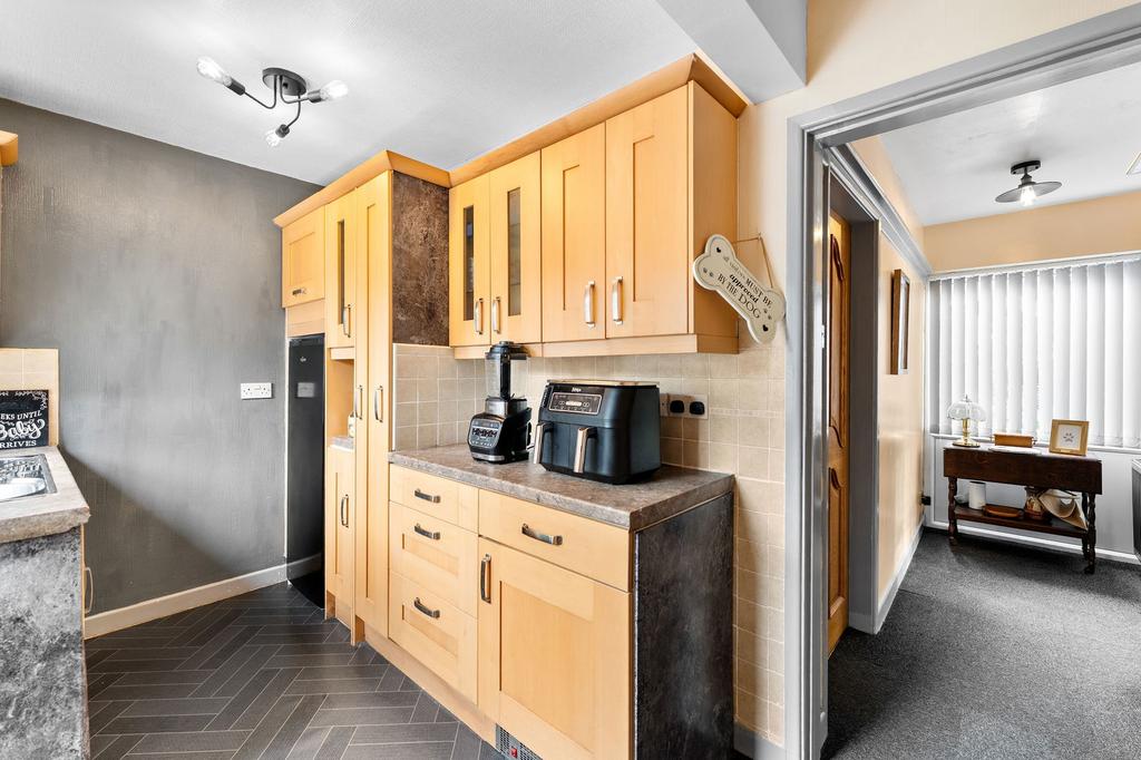Fitted with a range of wall and base units with worksurfaces over incorporating a one and a half bowl sink and drainer unit with mixer tap, integrated electrical oven, space for under counter fridge freezer, UPVC double glazed window and door leading out to the rear garden.