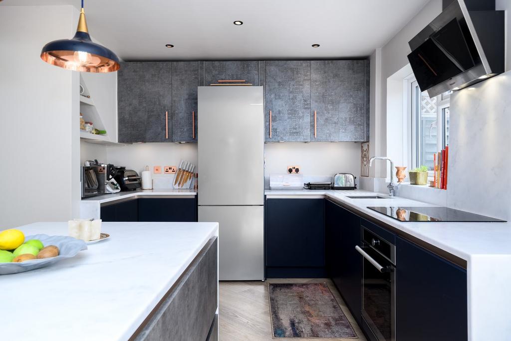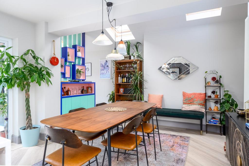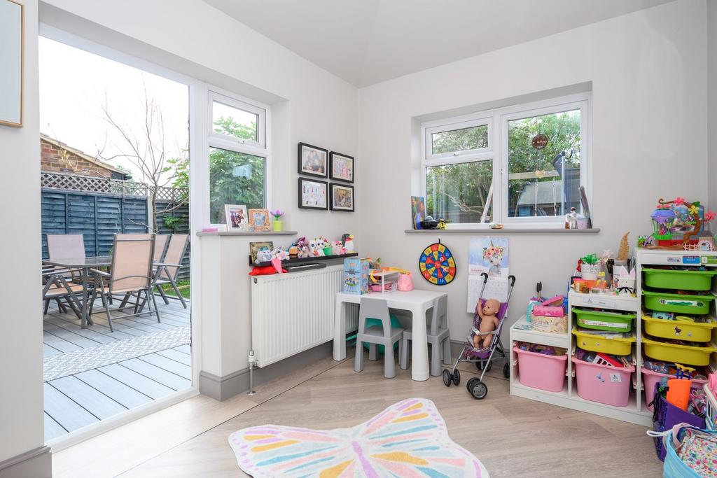 Finished to a high standard throughout, it offers exceptional space, style, and functionality—ideal for modern family living. The ground floor boasts a superb open-plan kitchen/dining/living space at the rear, thoughtfully designed for both everyday living and entertaining. A stylish bespoke shelving unit subtly divides this space to create a flexible study or play area. The kitchen features an impressive range of contemporary units with Carysil Minerva solid worktops, integrated appliances, and a central island—perfect for social gatherings. French doors open onto the south-facing rear garden, while a vaulted ceiling with Velux windows floods the space with natural light.