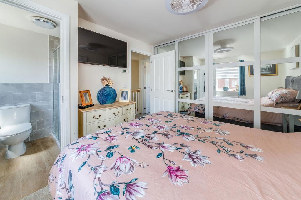Bedroom three: Double bedroom with UPVC double glazed window overlooking green area to front aspect. Radiator. Built-in double wardrobe with sliding mirrored doors.