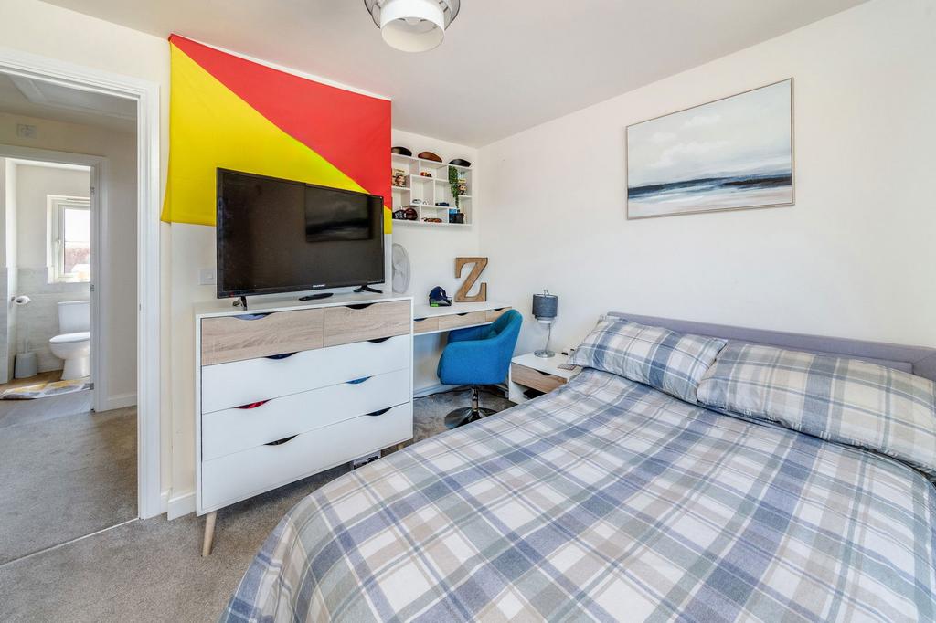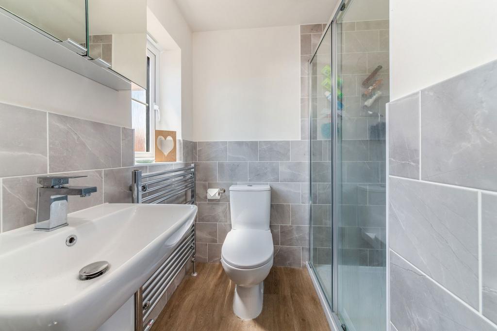 En-Suite: Three piece white suite comprising of low level WC and wash handbasin, double shower cubicle with Bar shower over. Heated towel rail. Tiling to splashback areas. UPVC double glazed obscured window to rear aspect.