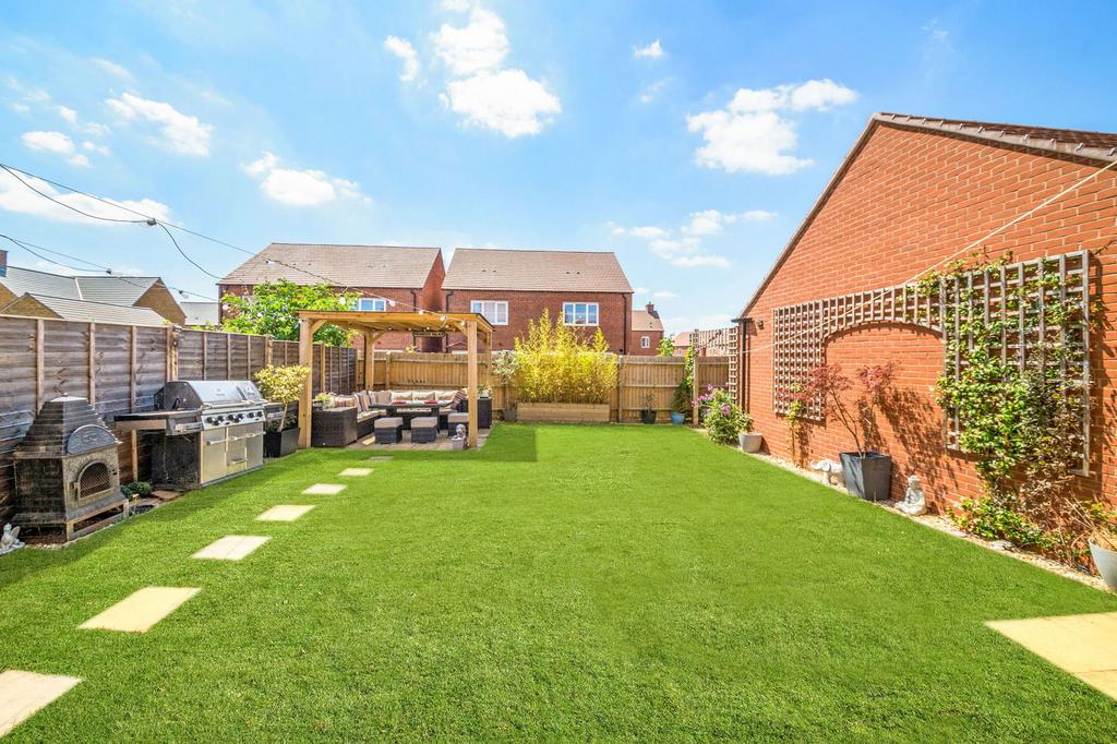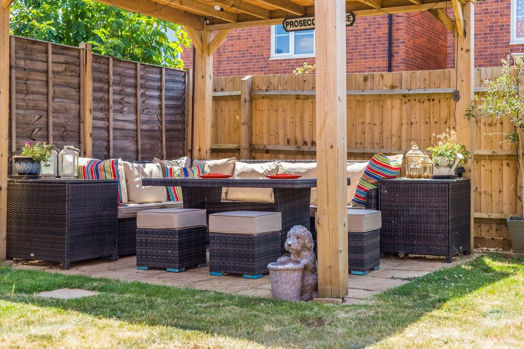 Rear garden: South/west facing aspect. Paved patio area the rest of garden is mostly laid to lawn with gated side access leading to parking area. Outside tap. Pathway leads through to the rear of the garden where there is a second seated patio area and pergola. Storage area behind garage. The garden is enclosed by timber panel fencing.