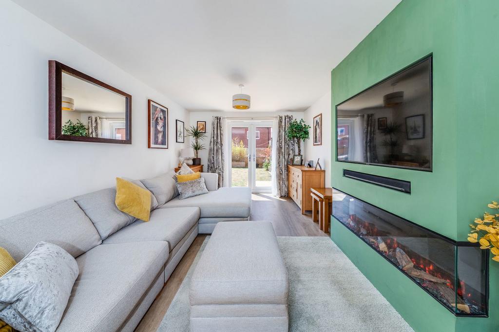 Living room: Dual aspect room. Feature smart fire. Luxury vinyl wood effect plank flooring. UPVC double glazed window overlooking greenery to front aspect. Two radiators. UPVC double glazed double doors opening onto rear patio area.