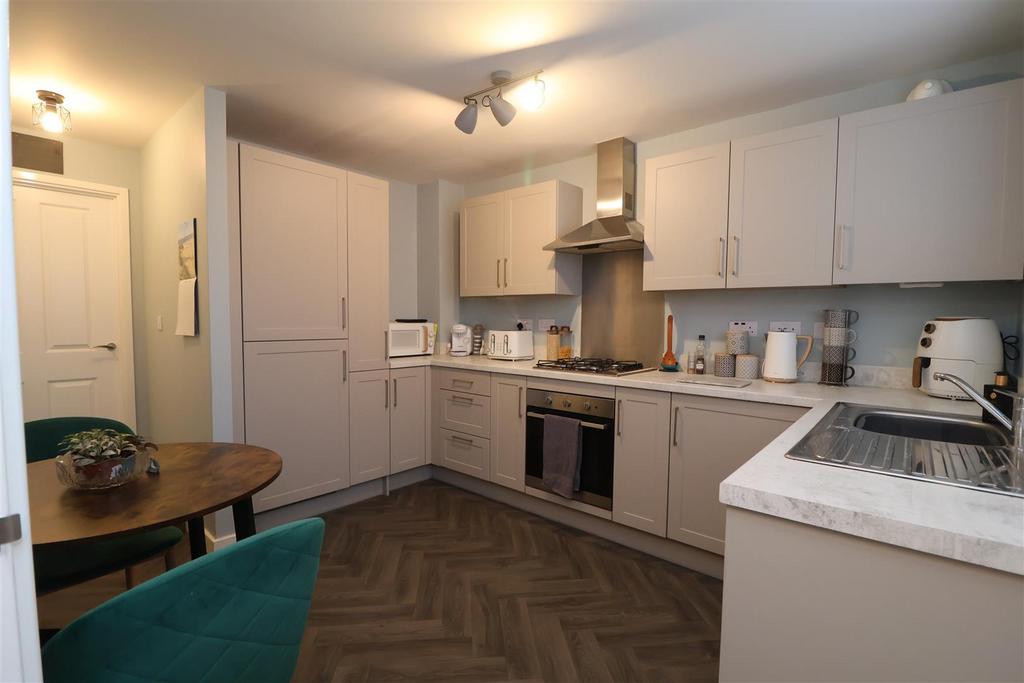 Kitchen/Diner - 3.6 x 3 (11'9" x 9'10") - The well-appointed grey Shaker-style kitchen features a range of integrated appliances, including a fridge/freezer, dishwasher, washing machine, four-ring gas hob with extractor above, and a fan-assisted oven. Complemented by marble-effect worktops and herringbone vinyl flooring, the space is brightened by a uPVC window overlooking the front elevation.