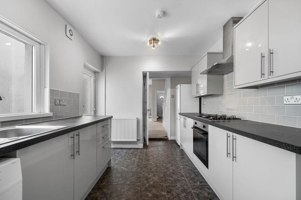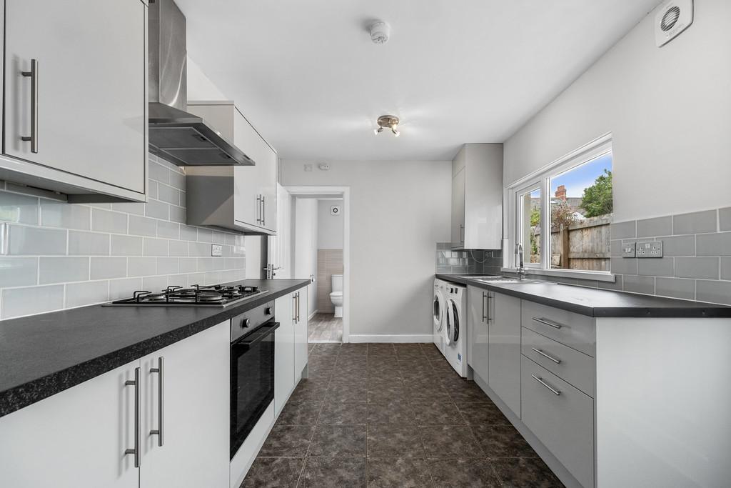 KITCHEN 15' 6" x 8' 7" (4.74m x 2.63m) Modern fitted kitchen with a range of wall, base and drawer units with worktops over incorporating stainless steel sink and drainer with mixer tap over and four ring gas hob with extractor above and oven beneath. Tiled splashback. Space for fridge/freezer, washing machine and tumble dryer. Double glazed uPVC window to side aspect. Power points. Two light fittings. Cupboard housing boiler. Tiled flooring. Door leading to bathroom. Radiator. Double glazed obscure uPVC door leading to rear garden.