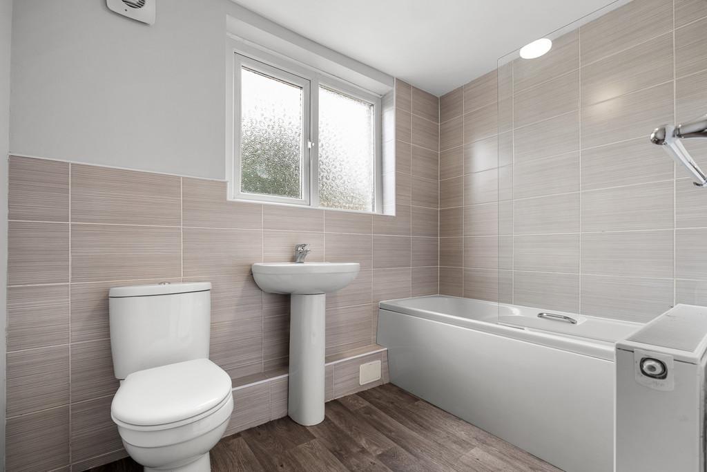 BATHROOM 7' 1" x 8' 3" (2.16m x 2.52m) Vinyl flooring. Partially tiled walls. Obscure double glazed uPVC window to rear. Extractor. Radiator. White three-piece-suite comprising WC, pedestal wash hand basin with mixer tap over and panelled bath with mixer tap over and mains powered shower above.