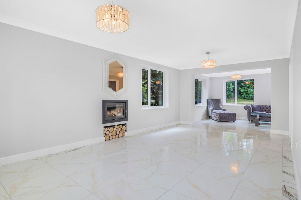 A large room with windows to the front and side, underfloor heating and an attractive inset log burning stove.