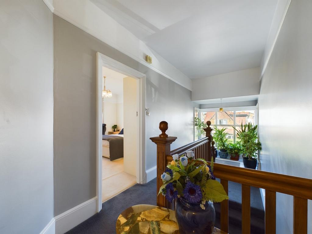 This is a large L shaped landing featuring a large box bay window to the side of the property with window seats, radiators, high level skirting boards, picture rail, loft hatch and carpet flooring. There are doors leading off to the bedrooms and bathroom.
