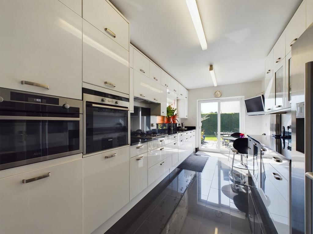 5.16m x 2.80m (16' 11" x 9' 2") This double aspect room features a double glazed window to the side of the property and double glazed sliding doors to the garden. The kitchen comprises an extensive range of white high gloss units with a range if integrated appliances, black granite worktops with a stainless steel sink inset, contemporary style column radiator, ample space for a dining table and chairs and tiled flooring.