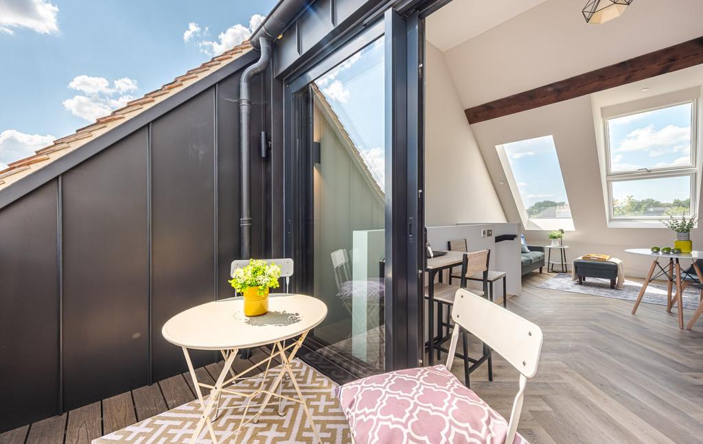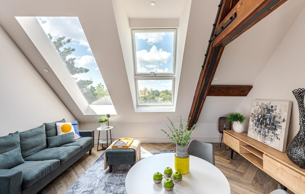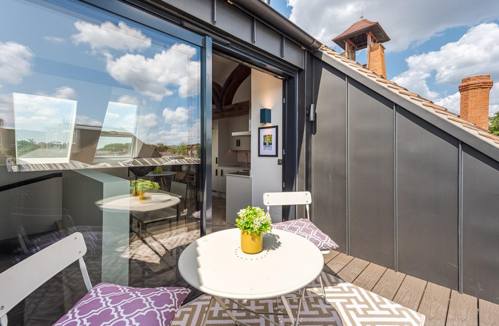 Ascending to the upper level, you arrive in the heart of the home: an open-plan kitchen and reception room. Here, exposed wooden beams span dramatically across the ceiling, paying homage to the building’s original features, while oversized Velux windows flood the space with daylight. The bespoke kitchen seamlessly blends into the living area, featuring sleek cabinetry, new integrated appliances and quartz stone worktops. From this entertaining space, sliding doors open onto your own private roof terrace—a rare find in central Streatham, perfect for entertaining or al fresco dining.