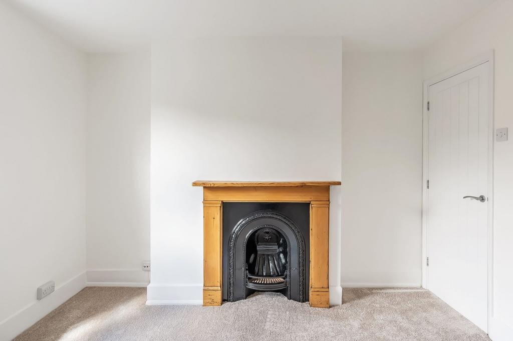 - Two first-floor double bedrooms with exposed brick fireplaces and built-in storage