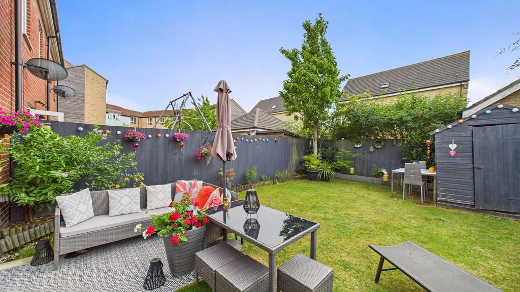 The rear garden offers a good degree of privacy, with patio area, laid predominantly to lawn, established borders, shed to remain, side passage with path leading to gate to front and outside water tap.