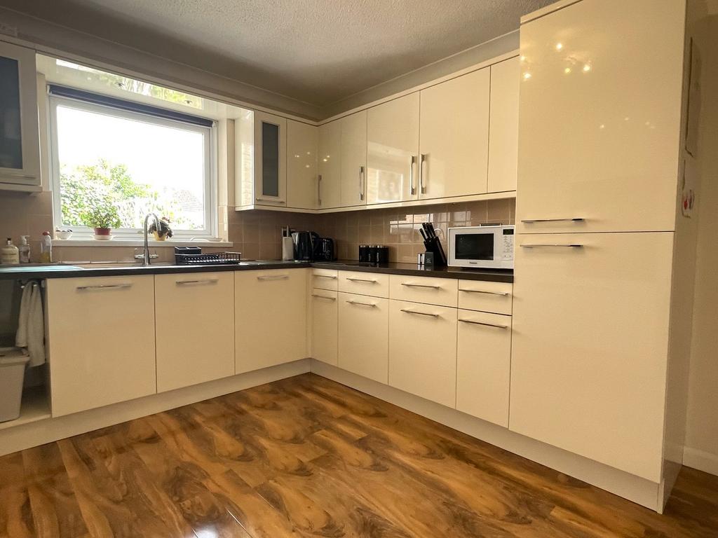The kitchen has been stylishly fitted to three sides with a range of matching wall and base units with co-ordinating handles. U shaped run of work surface with inset one and a half bowl stainless steel sink and drainer with chrome mixer tap, with cupboards beneath including built in washing machine. Inset four ring Hotpoint induction hob, with extraction above and full height unit alongside incorporating built in double oven and grill. Built in fridge freezer.