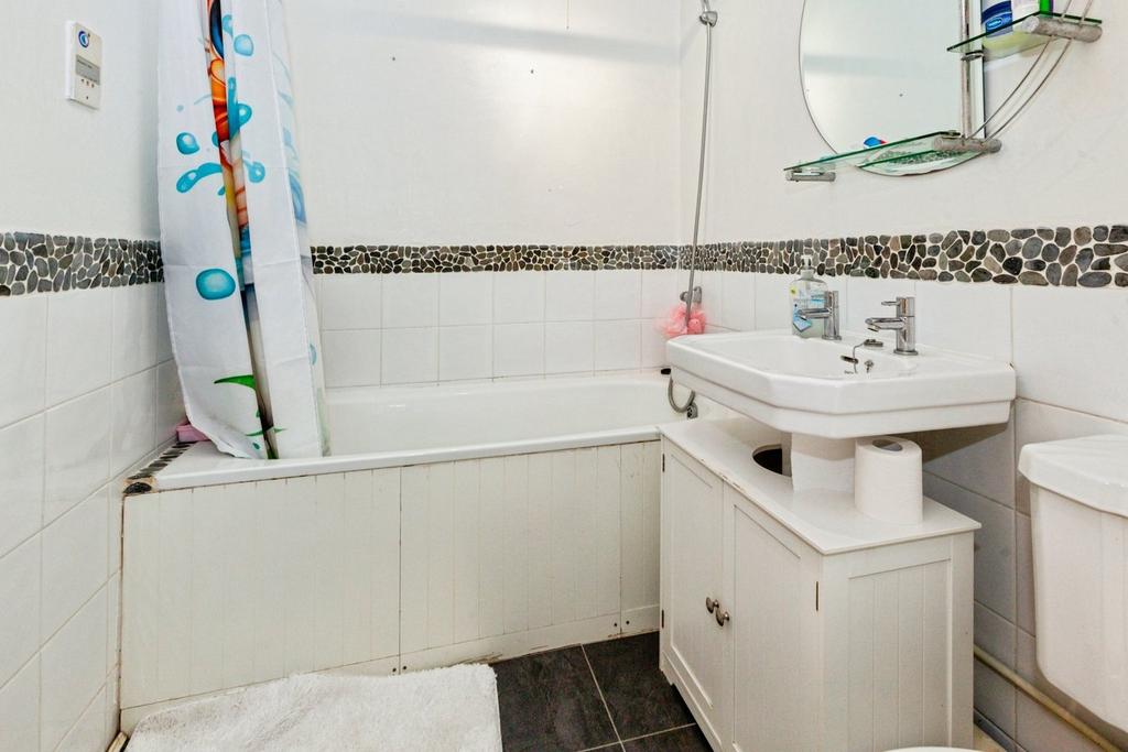 Bathroom - A three piece fitted bathroom suite comprising of a low-level WC, a wash hand basin, a panelled bath with an overhead shower, tiled flooring, and fully tiled walls.