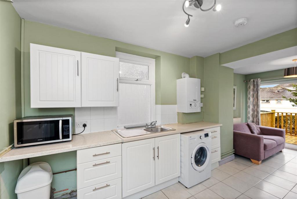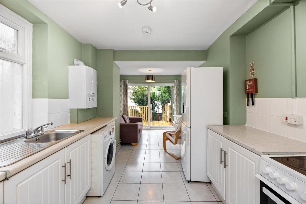 Kitchen Diner - 6.01 x 2.77 (19'8" x 9'1") - Galley kitchen open to the living/dining space. Featuring tiled flooring, radiator, PVCu windows & sliding patio doors to the garden. The kitchen comprises a range of wall & base units, stainless steel sink, oven, washing machine, tumble dryer and fridge freezer, also with pantry for storage.