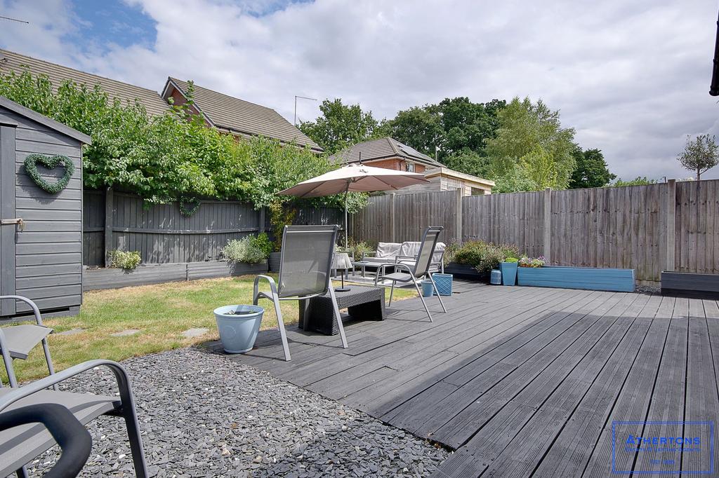 Outside, the rear garden is a delightful retreat, featuring a raised decking area ideal for alfresco dining or relaxing, a level lawn perfect for children or pets to play, and a good-sized shed providing useful storage space. To the front of the home, a driveway provides convenient off-road parking.