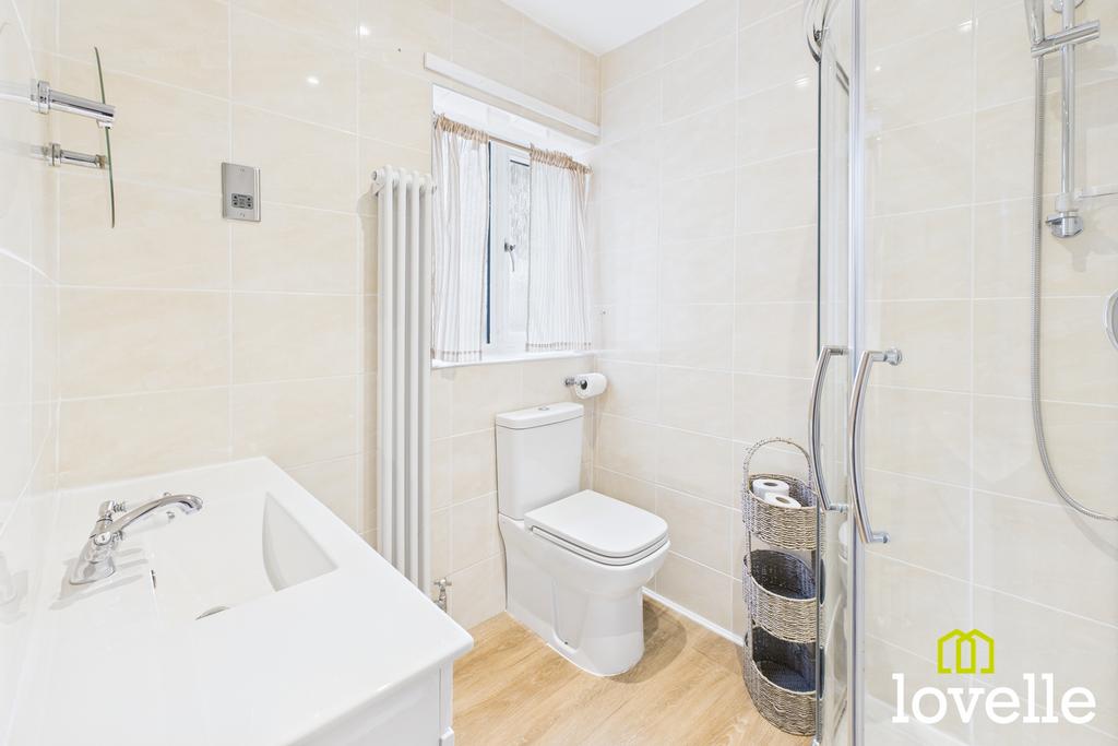 Fitted with a three piece suite comprising walk in shower cubicle, low flush WC and vanity unit with inset wash basin. Contemporary vertical radiator, tiled walls and a uPVC window.