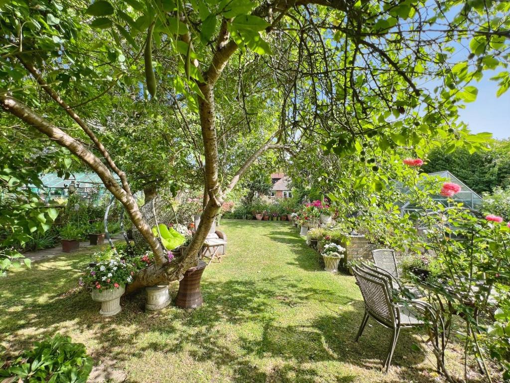 The garden is a real feature of the home and is filled with an array of established plants, trees and shrubs, with central lawn, ornamental pond, and multiple seating areas. There are two right of way points allowing pedestrian and vehicle access to the rear of the property. To the front is a large, gravelled driveway offering ample off-road parking and a large detached garage.