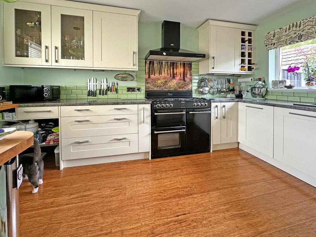 KITCHEN/BREAKFAST ROOM 12' 4" x 9' 9" (3.76m x 2.97m) (max) Attractive double aspect room with Upvc double glazed windows to front and rear aspect. Modern fitted Shaker style kitchen with excellent range of base, wall and drawer units in cream finish. Roll-edge worktop with tiled surround and inset composite sink. Fitted Belling Classic range style dual fuel cooker with matching cooker hood over. Integral fridge/freezer and dishwasher. Useful larder style open cupboard with fitted shelving. Matching quality engineered wood flooring.