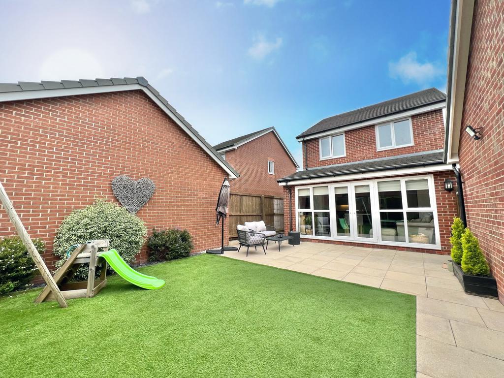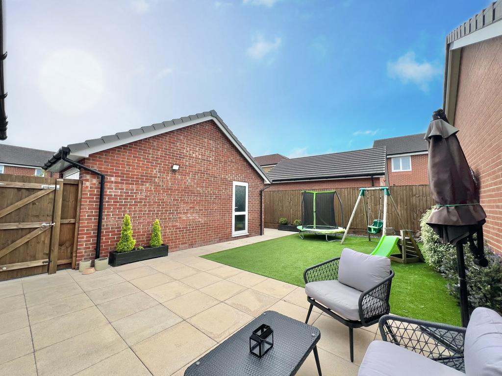 Landscaped private rear garden, mainly paved with laid to lawn area.