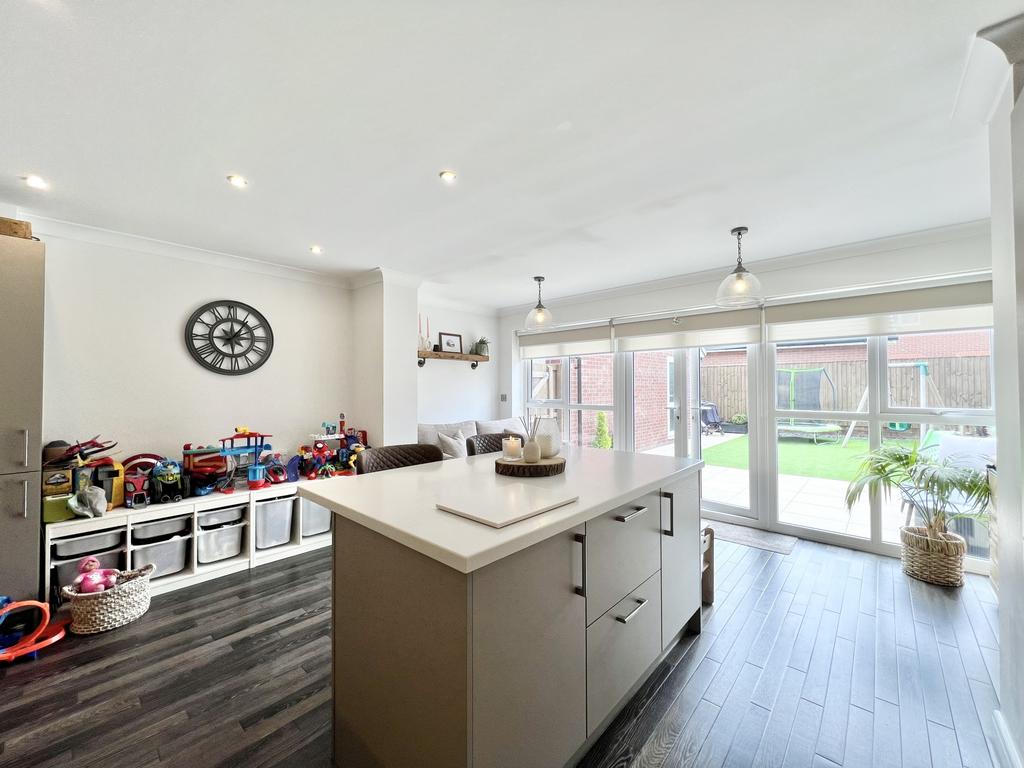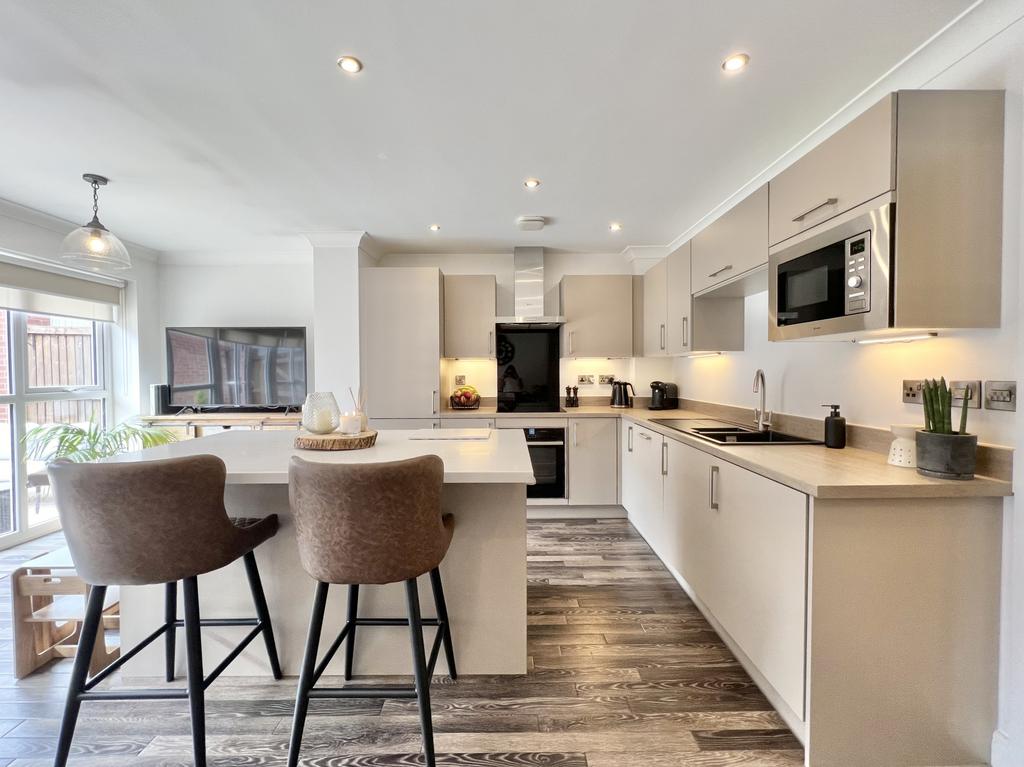 A modern fitted kitchen with a range of wall and base units with complimentary work surfaces, integrated Neff appliances including; dishwasher, fridge/freezer, microwave and induction hob with extractor fan over, sink unit with mixer tap and drainer, radiator and island with under storage.