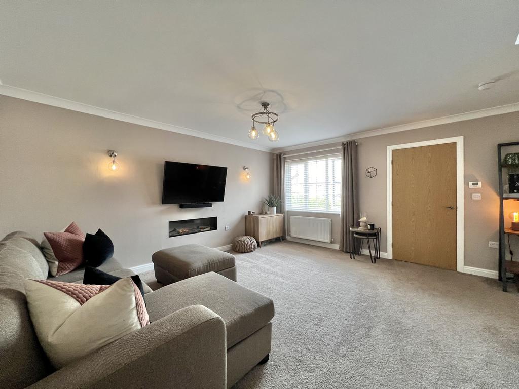 UPVC double glazed window to the front aspect, electric fire, storage under the stairs housing dryer and fuse box, two radiators and staircase leading to the first floor.