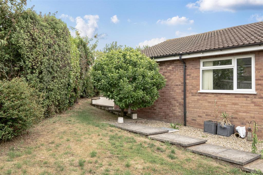 Outside - Gardens surround the property with a driveway for two vehicles. The front garden is laid to lawn with small borders and low box hedging. The main rear garden is enclosed and laid to lawn with planted borders, a variety of hedging, mature shrubs, and a side gate giving access to the drive. A tarmac driveway provides parking for two vehicles nose to nose and leads to a single garage.