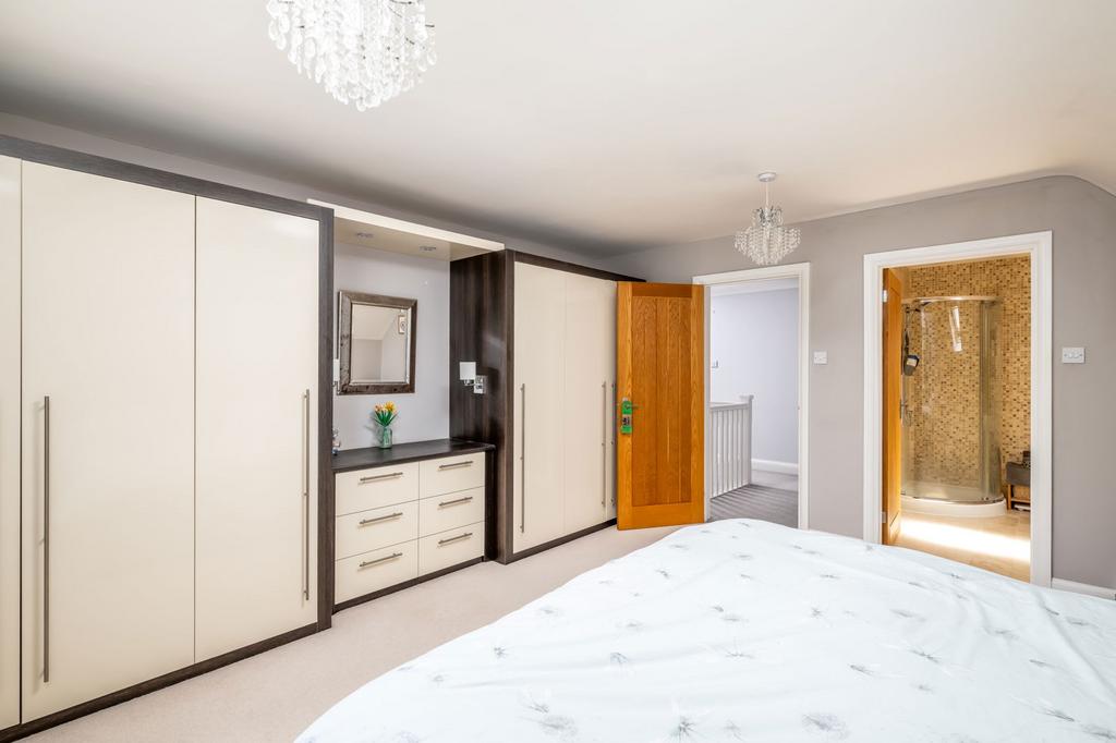 Upstairs, you’ll be surprised by the space – a far cry from the home’s bungalow beginnings. A two-storey rear extension eliminates any worries of sloping ceilings or compromised headroom, offering four generously sized double bedrooms, including a main bedroom with en-suite, and a stylish family bathroom.
