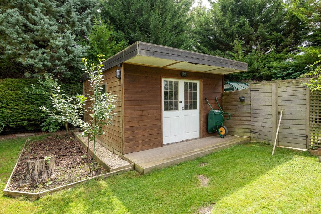 Externally, this home continues to impress. The expansive frontage offers both kerb appeal and functionality, while the rear garden is a true private sanctuary. Bordered on one side by mature trees, a broad patio stretches across the back of the house, with access from both the living room and kitchen-diner. A sweeping lawn – punctuated by flower beds and fruit trees – leads down to a large garden studio. Currently used for storage, it offers exciting potential to become a home office, creative studio, gym, or even a Wo(man) Cave. Beyond, a discreet gate opens to an additional section of garden – perfect for those who enjoy ‘the good life’ – complete with a greenhouse, space for raised beds, and more. Three sheds, a covered workshop, and a carport to the side of the property further underline just how much this home has to offer.