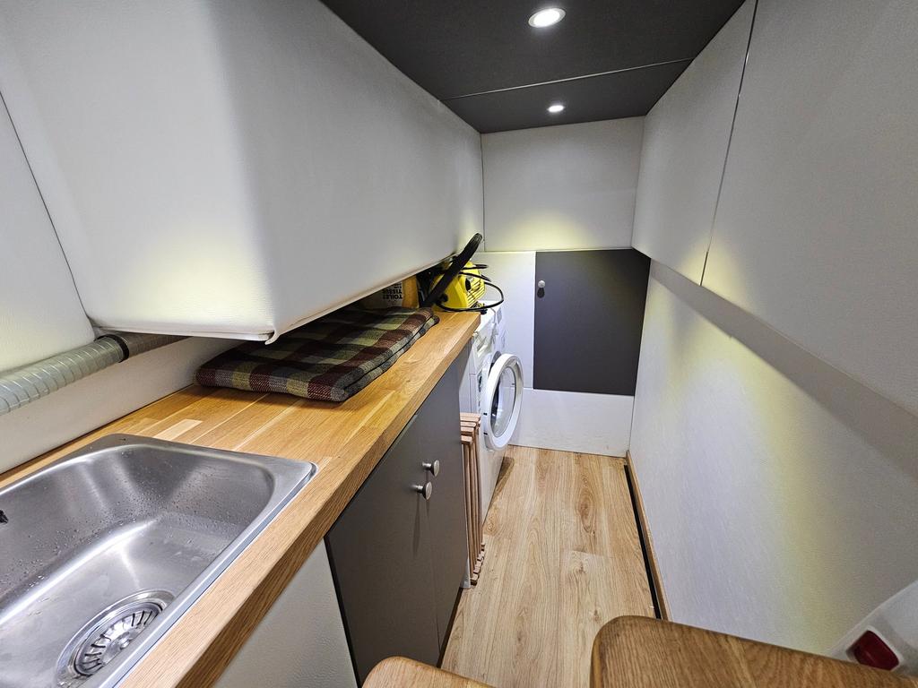 Modern kitchen with twin electric hobs, oven/grill, fridge, and laundry area