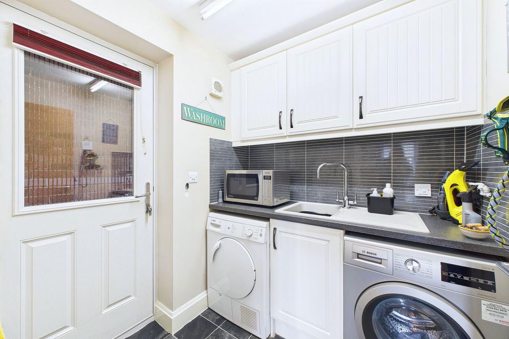 Utility Room Accessed from the kitchen and also via an external door leading into the covered alleyway, this practical space is fitted with matching wall and base units, a sink with mixer tap, space for a washing machine, and space for a tumble dryer.