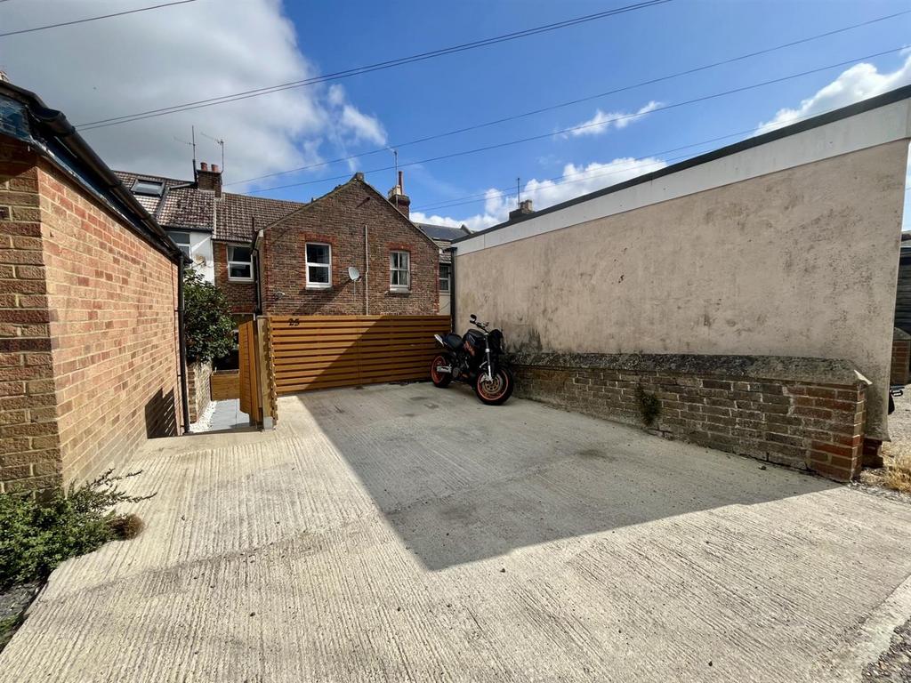 Outside, the rear garden is mainly decked with rear access gate leading to an area of parking for several vehicles.