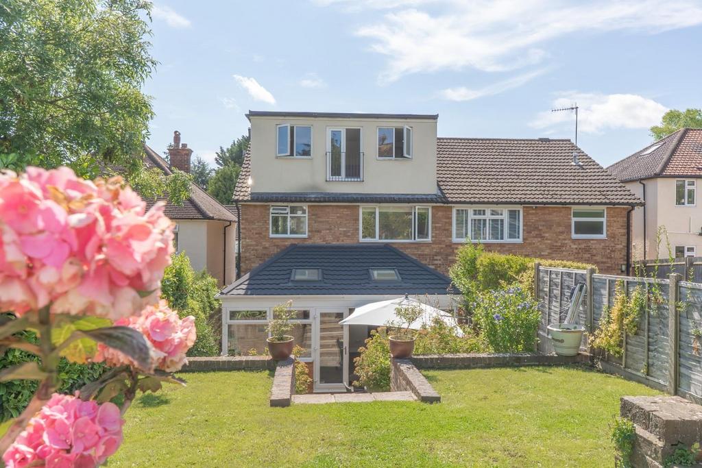 Outside, the beautifully landscaped rear garden is laid mainly to lawn and arranged over three levels, featuring two patio areas and mature borders filled with shrubs and flowering plants. The front of the property boasts a large driveway with parking for multiple vehicles, an EV charge point, and access to a garage that provides ample storage and houses the combination boiler and pressurised water tank.