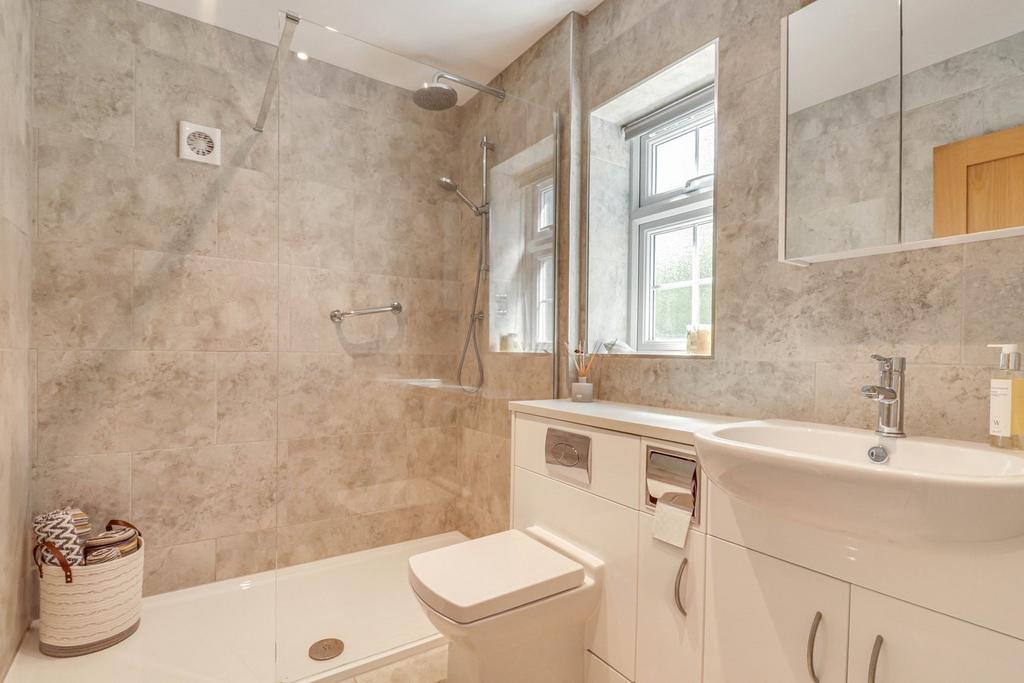 A fully tiled room comprising large recessed shower enclosure, low level W.C. with concealed cistern and a wash hand basin with storage beneath. Chrome towel radiator. Extractor fan. Obscured double glazed window to rear aspect.