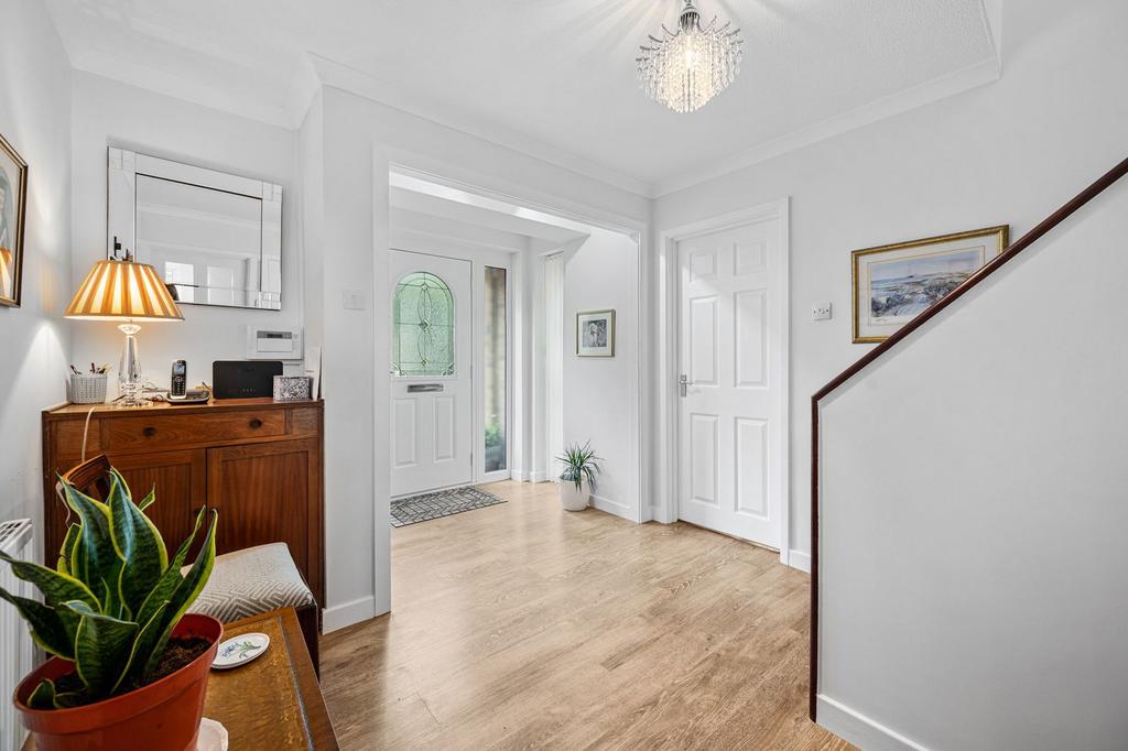 - Entrance Hall - with wood effect specialist flooring, stairs rising to first floor, Cove cornicing, white panel interior doors leading to;
