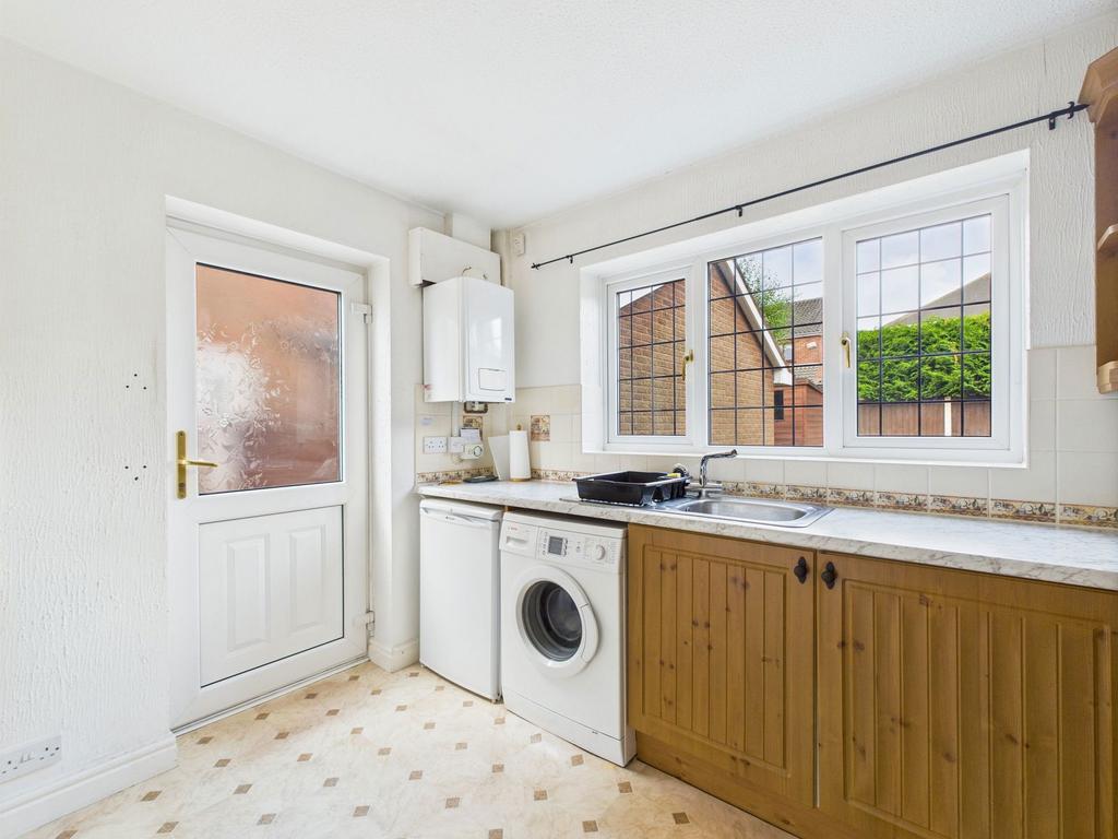 The kitchen, currently fitted with matching wooden wall and base units and white countertops, is a practical and functional space. A large window overlooks the back garden, and there's easy access to the driveway via a side door—ideal for everyday convenience. There's room for all essential appliances and plenty of potential to modernise.