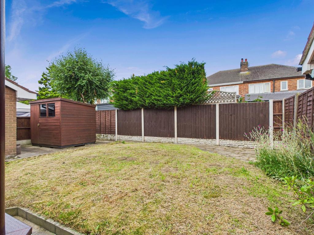 To the rear, the sizeable garden offers a mix of lawn and paved areas, ideal for outdoor living, play, or gardening. A garden shed adds further storage options.