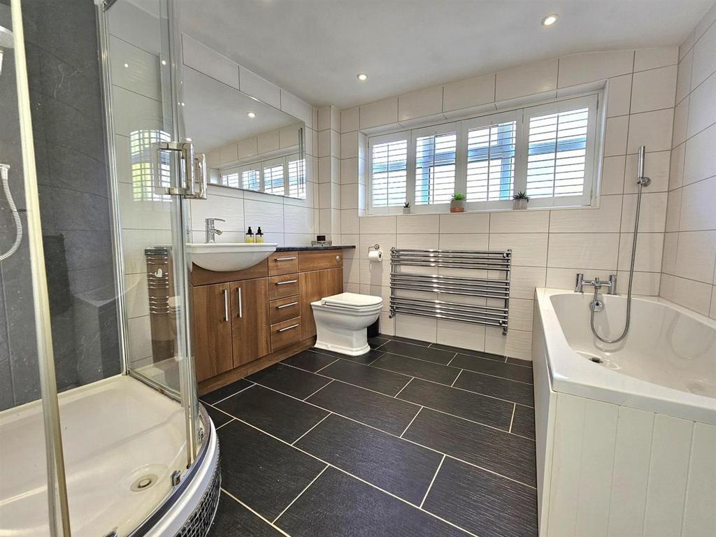 Bathroom - Modern bathroom suite comprising W.C, vanity unit, shower enclosure and bath with tiled surround. Frosted window to front aspect with window shutter.