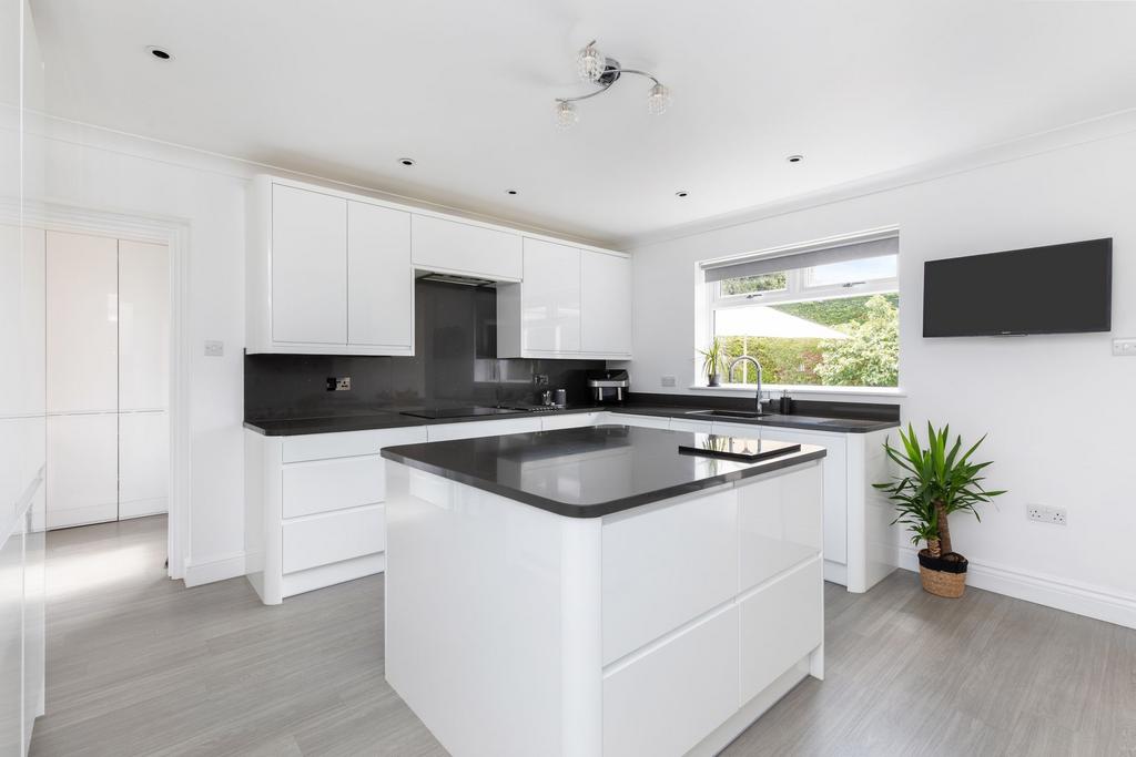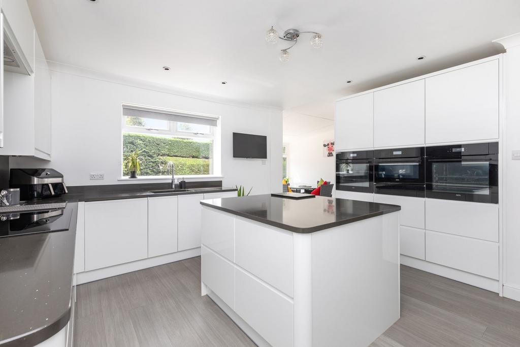 The modern kitchen/breakfast room enjoys views across the garden and is fitted with a range of integrated appliances. Adjacent is a convenient utility room with additional garden access. Completing the ground floor is a generously sized study and a cloakroom.