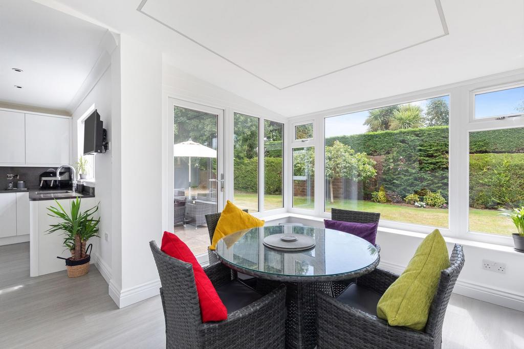 Upstairs, all five bedrooms are generously proportioned, most of which benefit from built-in wardrobes. The principal suite is particularly noteworthy, boasting a large dressing area and its own private en-suite bathroom. The second-largest bedroom also enjoys views over the garden and an en-suite. The family bathroom is also accessed from the landing.