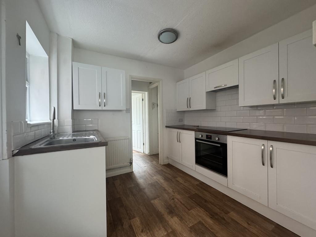 Modern fitted kitchen with oven and hob, plumbing for a washing machine and space for fridge/freezer.