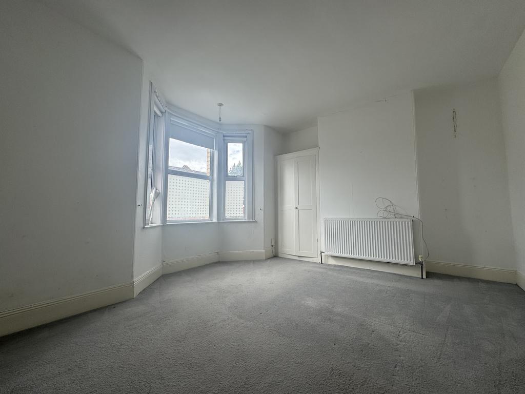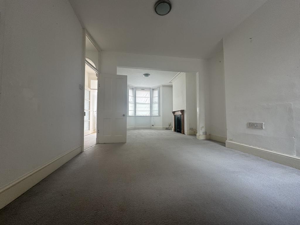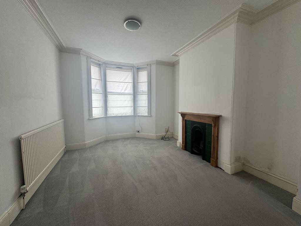 Open plan Sitting Room/Dining Room with bay window and feature fireplace.