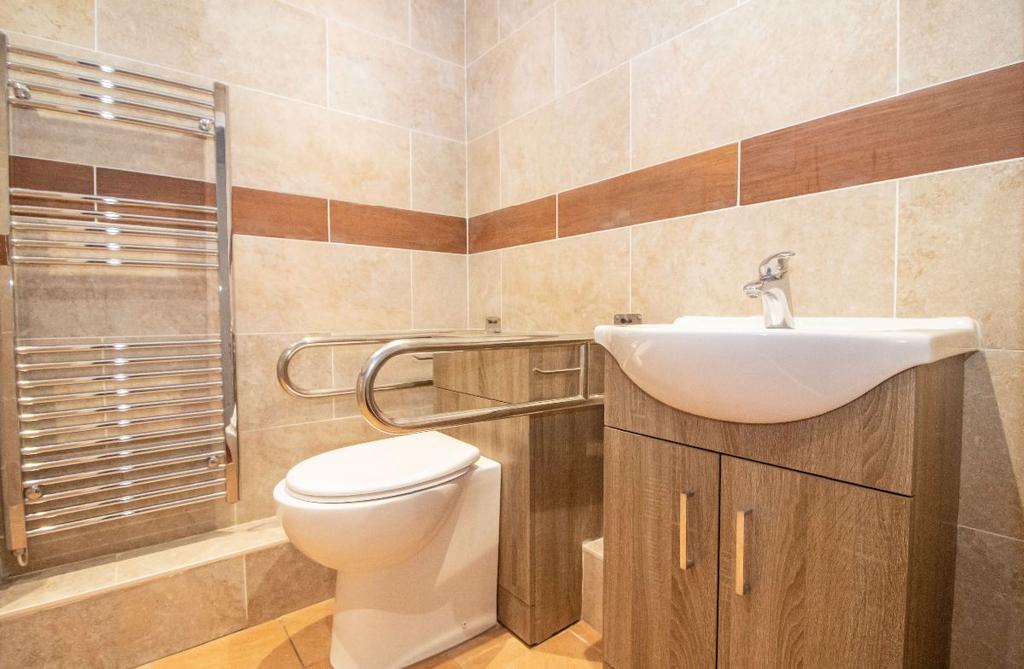 Modern refitted suite comprising wall mounted shower and wall mounted foldaway seat, close coupled low level wc with wall mounted grab rails, wash hand basin set in vanity unit, chromium ladder style heated towel rail, floor tiling with drainage area, full wall tiling, smoothed ceiling with pin spot downlighting, emergency alarm pull cord.