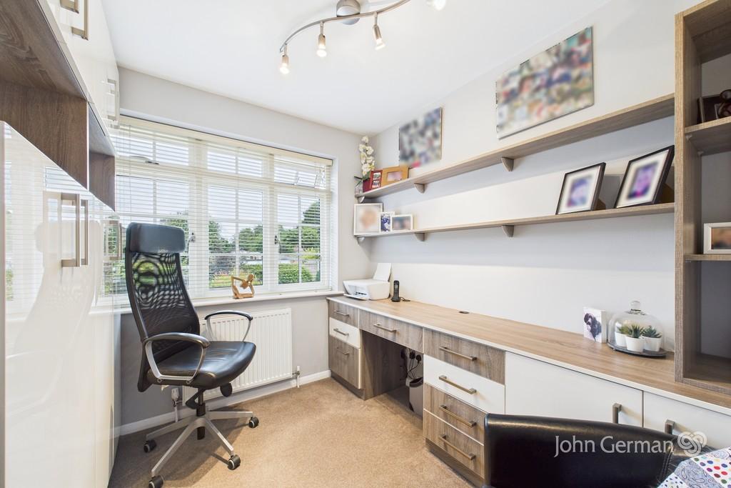Bedroom four has been expertly fitted as a home office, complete with a custom desk, drawers, shelving, and tall soft-close cabinets-ideal for remote working. A loft hatch with ladder provides access to a boarded and lit roof space, perfect for extra storage.