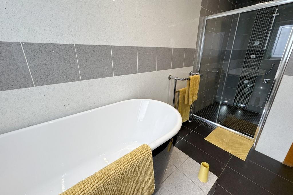 A stylish bathroom of generous size which includes a raised plinth with freestanding tub bath and pillar tap, a separate recessed shower enclosure with twin head thermostatic shower unit, wall mounted hand wash basin with drawers under, low level WC. Heated towel rail, extractor fan, double glazed window to side, gloss wall tiling, tiled floor with under floor heating