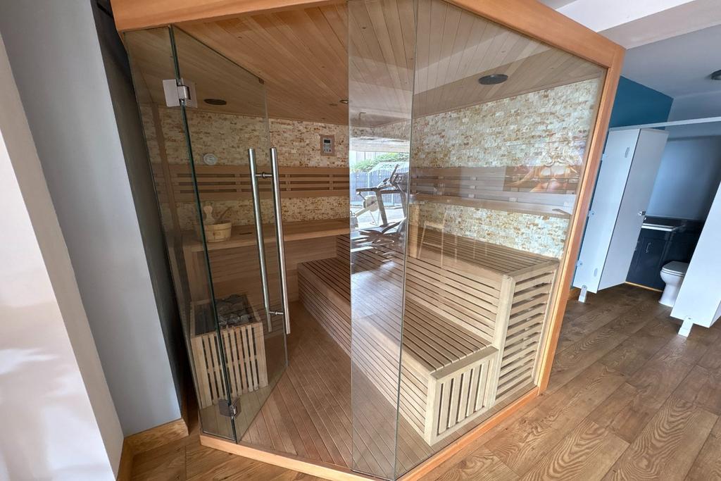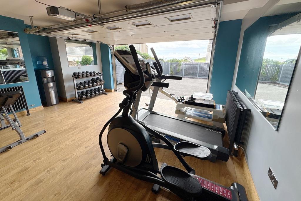 The ground floor level includes a large open room for garaging a number of vehicles. The size has allowed the area to be sub-divided and it now includes a gym area with wall mirrors, a bar with counter and storage, a fantastic sauna with radio and glass window & door and an enclosed WC. The garage is accessed via a motorised up/over door and a door by the sauna leads to a staircase rising to main hall.