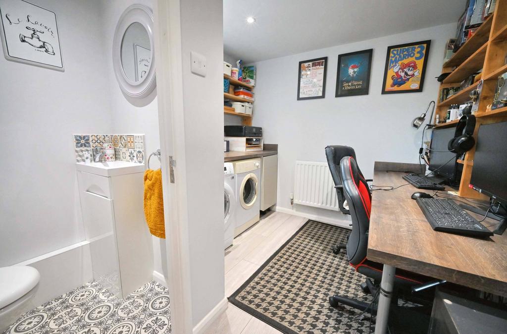 Utility/ Office: 9’9’’ (3.04m max) x 7’9’’ (2.41m) Built in base cupboard with matching laminate worktop including matching desk, radiator, recessed ceiling spotlight, laminate flooring and double glazed opaque window to side. Fitted Cloakroom: White low level WC, sink unit, tiled effect vinyl flooring and recessed ceiling spotlight.